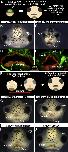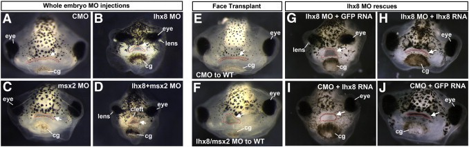 Supplemental Fig. 4. Morpholino injections targeting lhx8 and msx2. A) Frontal view of tadpoles at 4 dpf showing the shape of the embryonic mouth (dotted in red) after injections of each of lhx8 MO, msx2 MO or both lhx8 and msx2 MOs. E,F) Frontal view of 4 dpf tadpoles showing the shape of the embryonic mouth (dotted in red) after lhx8/msx2 double morpholino injection and face transplants at stage 24. Abbreviation: cg; cement. Arrows point to the mouth in all figures. G) lhx8 MO rescues showing frontal views of the face. G) Representative of one of the 13% of embryos co-injected with lhx8 MO (90 ng) and control GFP RNA (200 pg) with a slight median orofacial cleft phenotype (n = 30, 2 experiments). H) Representative of one of the 62% of embryos co-injected with lhx8 MO (90 ng) and lhx8 RNA (200 pg) with normal facial phenotype (n = 84, 2 experiments). I) Representative of one of the 67.6% of embryos co-injected with control MO (90 ng) and lhx8 RNA (200 pg) with a smaller face and abnormally shaped mouth (n = 37, 2 experiments). D) Representative of one of the 100% of embryos co-injected with control MO and GFP RNA with normal facial phenotype (n = 53, 2 experiments). |