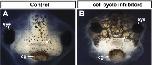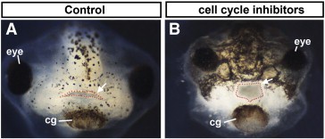 Supplemental Fig. 6. A,B) frontal view of tadpoles at 3 dpf showing the shape of the embryonic mouth (dotted in red) after hydroxyurea/aphidicolin (HU/A) treatment. Arrows point to the mouth in all figures. Abbreviation: cg; cement. |