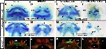 Fig. 8. AâH) Alcian blue staining showing cartilage in 4â5 dpf tadpoles. Top row shows the ventral views and the second row shows the dorsal views. IâN) Transverse sections at 3â4 dpf through the primary palate region. Collagen II immunohistochemistry (green) counterstained with propidium iodide (red). Abbreviations, sr; suprarostral, qua; quadrate, ir; infrarostral, Mk; Meckel's, ch; ceratohyal, bh; basihyal, eth; ethmoid, trab; trabecular, pq; palatoquadrate, np; nasal pit, oc; oral cavity. |