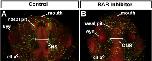 Supplemental Fig. 3. Dorsal views of the tadpole head showing tubulin immunohistochemistry (green) counterstained with propidium iodide (red), highlighting the brain, axon tracts and cilia. The major aim of this experiment was to show that the brain and nasal pits form after RAR inhibitor treatment. The width of the neural tube seems comparable in treated and controls (white bars). However, the space between the eyes and neural tube is reduced. |