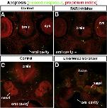 Supplemental Fig. 1. I. Retinoic acid reverses the RALDH2 morpholino induced cleft. A) Frontal views of embryos at stages 412. II. Retinoic acid reverses the RAR inhibitor (BMS-453) induced median dorsal cleft. E) Frontal views of embryos at stages 412. III. Citral treatment. I,J) Frontal views of embryos at stages 412. The mouth is outlined in red dots in all figures. |