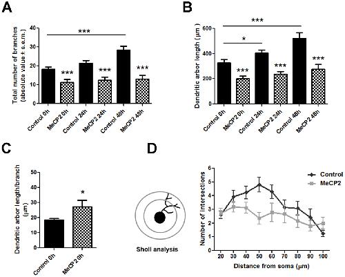 are longer than in controls. (D) Left; Sholl analysis was used to determine the number of dendritic crossings in MeCP2 overexpressing and control