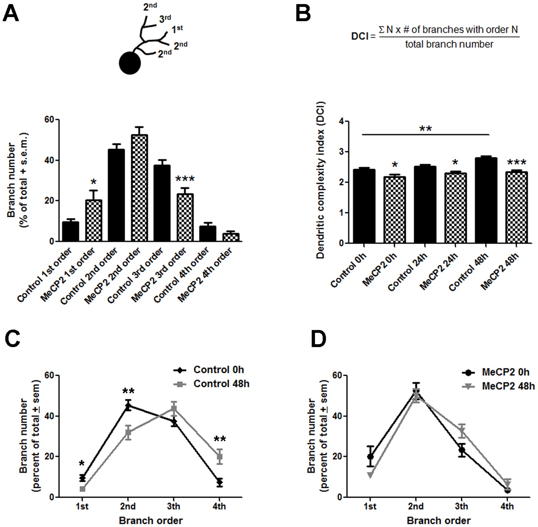 not change over time. C, D) Branch order distribution at 0 and 48 hours for (C) control, and (D) hMeCP2-expressing neurons. Note the significant shift