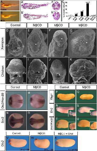 Fig. 4. Cholesterol depletion affects Xenopus and chick head development. Stage 9 embryos were injected with 2 mM, 20 mM, 40 mM and 100 mM of MβCD into the blastocoel and scored for anterior defects at stage 40. (A) Control embryos at stage 40 display normal morphology. (B) MβCD-injected sibling embryo presenting head defects such as microcephaly, absence of forebrain, cement gland small or absent, and eyes reduced or absent. Notice in longitudinal (A′ and B′) and coronal (A″ and B″) sections of stage 40, that in control embryos, the forebrain, ventricle, midbrain, hindbrain and eyes can be distinguished (A and A″), but in MβCD-injected embryos, the forebrain and eyes are dramatically affected (B and B″). The notochord is evident in both control and MβCD-injected embryos. (C) The graph shows the percentage of embryos displaying anterior defects in uninjected embryos and in embryos injected with different concentrations of MβCD. is the number of embryos scored. Asterisk represents dead embryos, which were not scored. Representative photomicrographs of Xenopus (D, stage 40) and chick (H, E3) untreated (control D, H) and MβCD-treated embryos (E, I). Control embryos developed complete face structures, while cholesterol-depleted embryos showed truncated or absent anterior structures. The phenotypes are scored by severity as: mild phenotype (E and I), intermediate phenotype (F and J), and severe phenotype (G and K). Mandibular process (MP). Optic vesicles (OV), frontonasal process (FNP), oral cavity (OC), cement gland (CG), nasal cavities (NC). Asterisk corresponds to OC in MβCD-treated embryos. Xenopus embryos in situ hybridization show the anterior marker Otx2 reduced after MβCD-induced cholesterol depletion, while the spinal cord marker, HoxB9, is not affected (L and M). The anterior domain of Sox2 expression is reduced in MβCD-injected embryos (N and O). The cement gland marker, Xag-1, is reduced in MβCD-injected embryos compared with the control (P); however, the expression of the isthmus marker En-2 remains unaffected in both the control and MβCD-injected embryos (R), but the distance (d) from En-2 expression domain to the most anterior region is shorter in MβCD-injected than in control embryos, evidencing forebrain reduction (insert R). Eye-field marker Six-3 was completely abolished in MβCD-injected embryos, but the rhombomere 3/5 marker Krox-20 was not affected in control and MβCD-injected embryos (T). MβCD was previously saturated with cholesterol (Chol) and then injected into the blastocoels. Whole mount in situ hybridization shows Otx-2 expression in control (V), reduced expression in MβCD-injected embryos (W), and normal expression in MβCD + cho-injected embryos (X). Scale bar: 100 μm (D) and 250 μm (H).