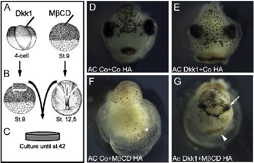 Fig. 7. Head anlage from MβCD-injected embryos is partially rescued by Dkk1. Schematic drawing showing animal caps (AC) of Dkk1 RNA injected embryos or control AC (A) were grafted to HA of control or MβCD-injected embryos (B). The explants were cultured until stage 42 (C). HA control with AC control generated normal heads (D). Dkk1 AC with control HA generated an anteriorized head (E). AC control with MβCD-HA generated a posteriorized head (F). Dkk1 AC with MβCD-HA generated head containing small symmetrical eyes (arrow) and cement gland (arrowhead, G). |