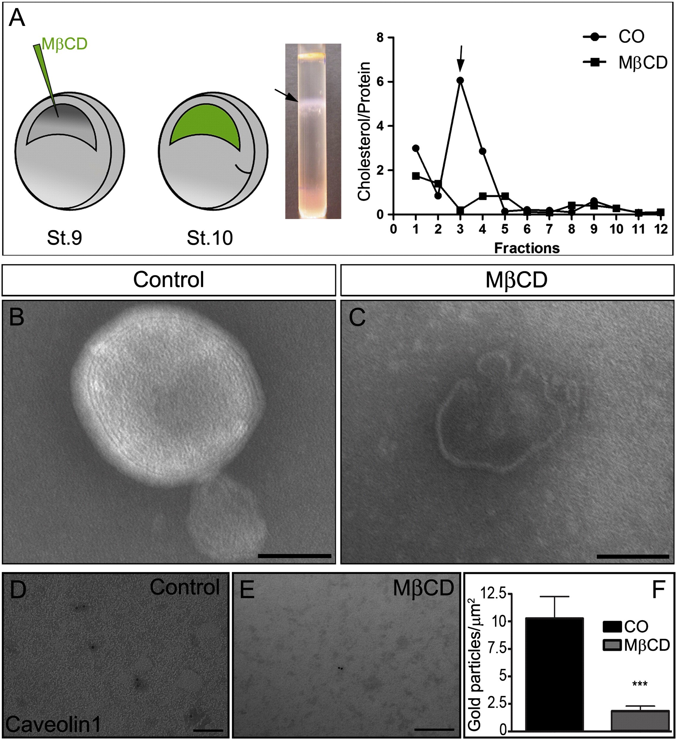 Fig. 2. MβCD disrupts Xenopus embryo CRMMs composition and morphology. (A) MβCD was injected into the blastocoel of stage 9 embryos and grown until stage 10. After centrifugation in sucrose gradient, CRMMs were observed as a turbid fraction in the light portion of the gradient (arrow). A peak of cholesterol content in light fractions characterizes the presence of CRMMs at the gastrula stage (arrow and circle lines). This peak is lost after MβCD injection, suggesting the disorganization of CRMMs (square lines represent the 40 mM MβCD cholesterol depletion). (B) The fraction with isolated CRMMs observed by negative staining, shows a multilamellar structure 73% (n = 15); while the fraction obtained from MβCD-treated embryos (C) shows a disorganized unilamellar vesicular structure 85% (n = 14). (D) Caveolin1 immunoassay of the CRMM fraction shows significantly decreased staining in the MβCD fraction compared to the control (CO) fraction. ***P < 0.001 by Mannhitney test. Scale bars: B, C, D: 0.1 μm; E: 0.2 μm. |