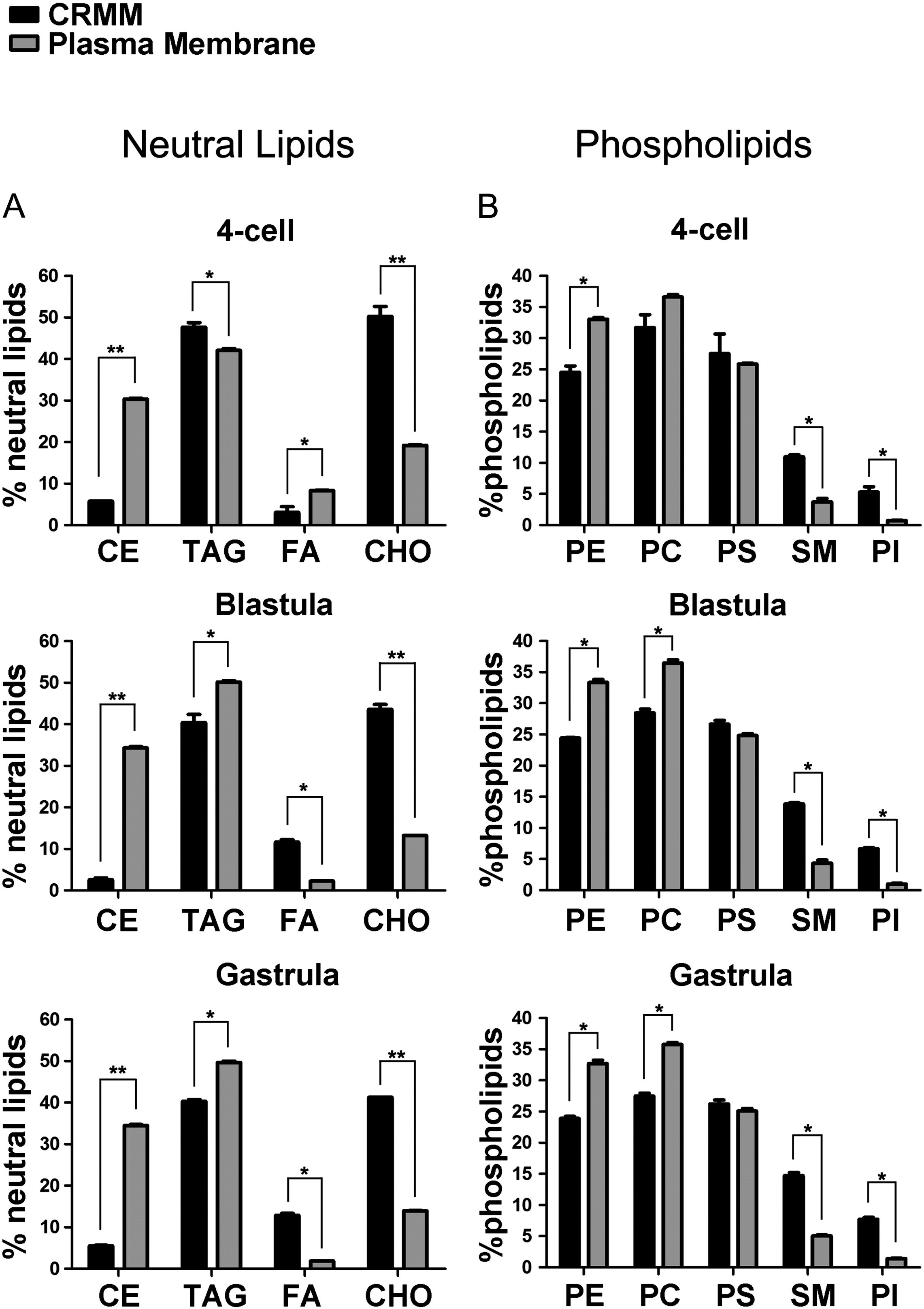 Fig. 1. CRMMs are present and have a dynamic composition during development. (A) Cholesterol content assays of the fraction obtained by the sucrose gradient showed a peak in low-density fractions at the 4-cell, blastula and gastrula stages. (B) Dot blot analysis revealed the presence of GM1 ganglioside and Caveolin1 protein in the low fractions. (C) Lipid characterization showed cholesterol (CHO) and triacylglycerol (TAG) as the most abundant among the neutral lipids, while phosphatidylethanolamine (PE), phosphatidylcholine (PC) and phosphatidylserine (PS) were the predominant phospholipids in the CRMM fraction. (CE) cholesterol ester, (FA) fatty acid, (SM) sphingomyelin, (PI) phosphatidylinositol. (*P < 0.05; **P < 0.01). |
