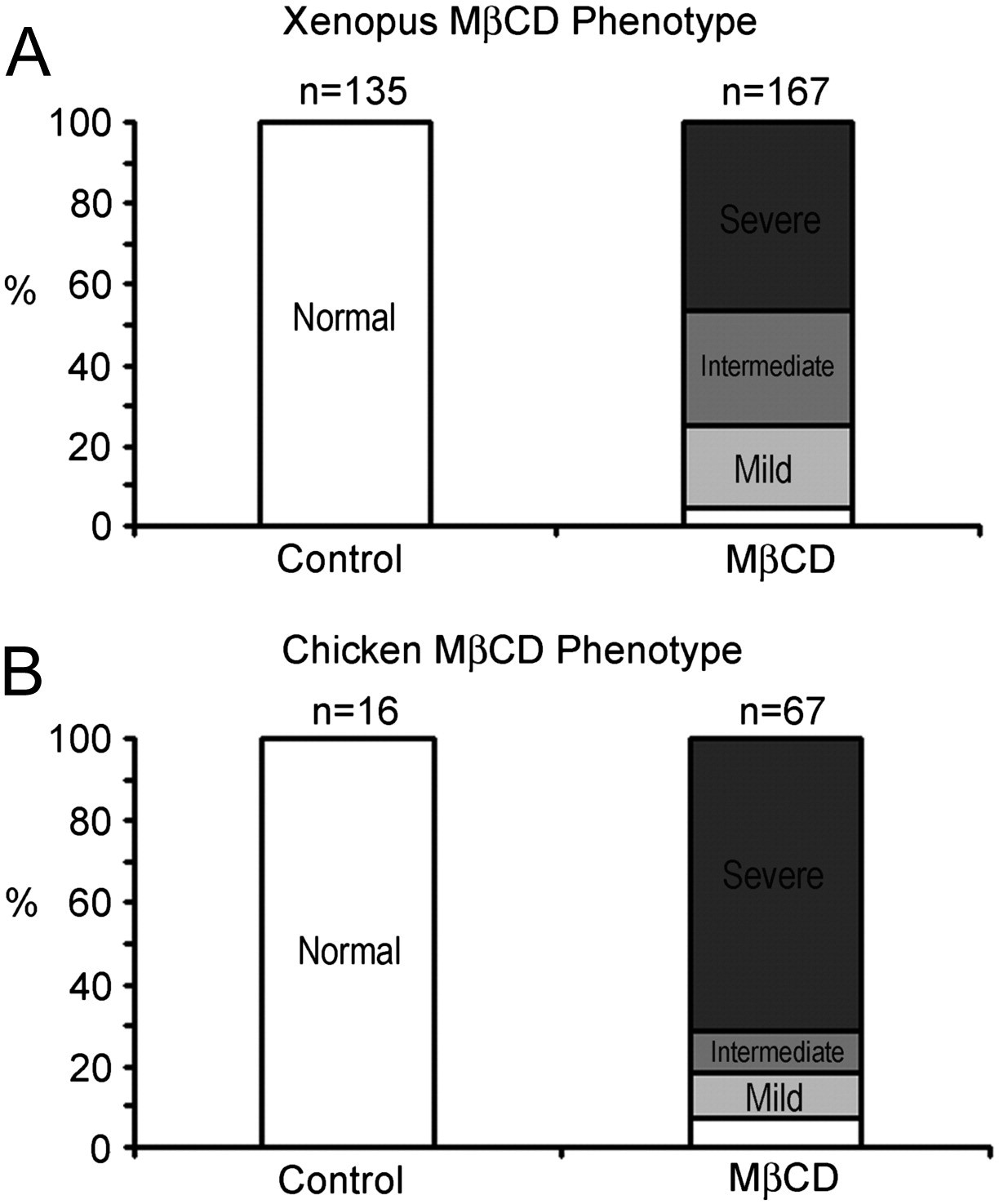 Fig. S3. Phenotype scoring of Xenopus (A) and chick (B) embryos in control and MβCD-treated embryos. In both Xenopus and chicks, the majority of the MβCD-treated embryos displayed the severe phenotype (50% in Xenopus embryos, n = 167, and 60% in chick embryos, n = 67). The intermediate phenotype comprised 25% in Xenopus and 10% in the chick, while the mild phenotype comprised 15% in Xenopus and 18% in the chick. |