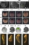 Fig. 5. Cholesterol depletion has no effect on the Spemann's organizer. Scanning electron microscopy shows the blastocoel roof and migrating post-mesodermal cells of the dorsal side. Bottle cells (Bc, light green) appear to be morphologically preserved in MCD-injected embryos (B) and control (A) embryos. In situ hybridization of chordin, goosecoid (Gsc), LIM1 and Otx2 in early gastrula Xenopus embryos (D). In both control (D) and MβCD-injected (H) embryos, the expression domains of these genes were not altered. Spemann's graft experiment where dorsal lips of uninjected and MβCD-injected gastrula embryos were grafted on the ventral side of uninjected gastrula embryos and developed until stage 35 (L). A control embryo develops normally (M). When the dorsal lip from a donor control embryo is grafted on the ventral side of a control embryo, a secondary axis containing the head is detected (N, arrow). MβCD-injected embryo showing loss of head structures (O). An MβCD-injected dorsal lip grafted on the ventral side of a control embryo is capable of inducing a secondary axis containing a head (P, arrow). |