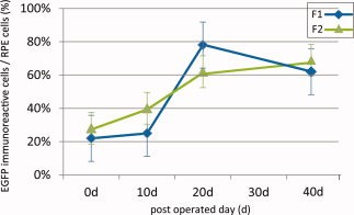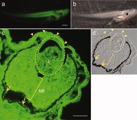 Complete retinal regeneration occurs after the removal of the whole tissue in mature Xenopus laevis, as well as in the newt. Here, we produced F1 and F2 lines of transgenic X. laevis containing an EGFP gene under a translation elongation factor 1-α (ef1-α) promoter and investigated how the gene is reactivated in retinal pigmented epithelial (RPE) cells when the neural retina (NR) is removed. The results showed that EGFP expression is reduced in the adult ocular tissues of nonmanipulated transgenic animals, and EGFP-expressing cells are occasionally found heterogeneously in the lens, NR and RPE tissues. During retinal regeneration, the EGFP gene is reactivated in the RPE and ciliary marginal cells. Transgenic animals were also used for a transplant study because of the genetic marker of the donor tissue. Transplanted RPE clearly transdifferentiated to regenerate the retina in the ocular chamber. This study is, to our knowledge, the first report of a transgenic study of amphibian retinal regeneration, and the approach is promising for future molecular analyses.