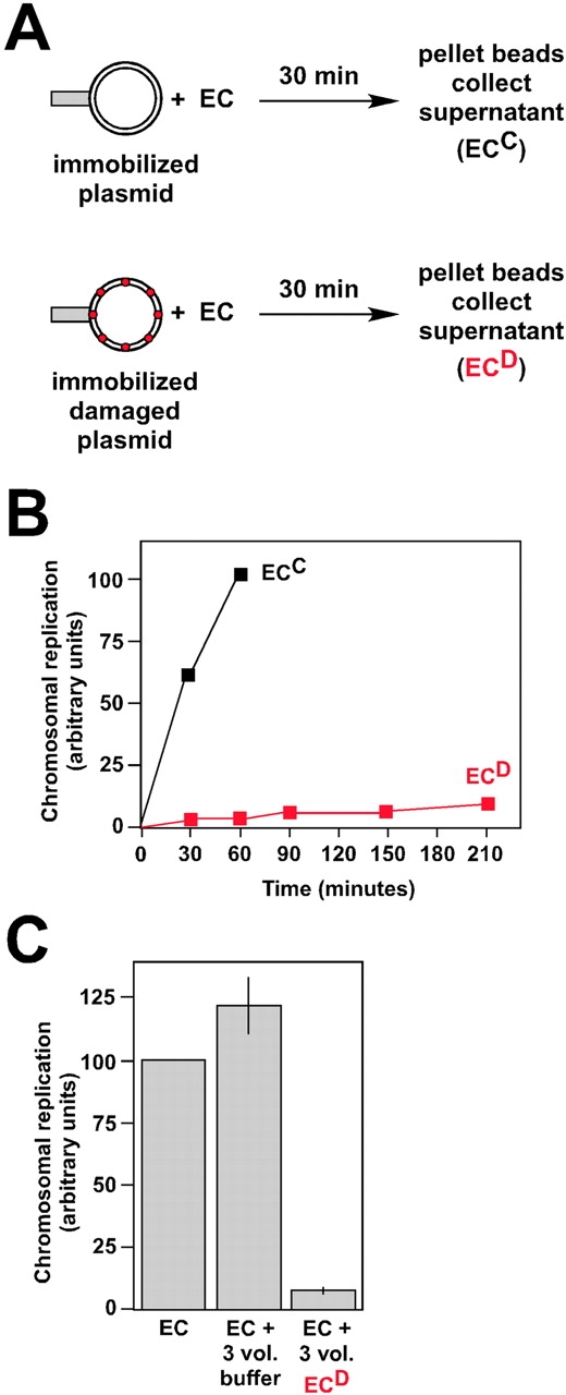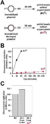 Figure 3. MMS-treated DNA generates a diffusible inhibitor of chromosomal replication. (A) Experimental strategy. Egg cytosol (EC) was mixed with either damaged or undamaged plasmid DNAs that had been immobilized on magnetic beads. After a 30-min incubation, the beads were separated from the extract by collection on a magnetic stand, and the extract was recovered. Extracts that had been exposed to undamaged, control plasmid are defined as ECC, whereas extracts that had been exposed to MMS-treated plasmid are defined as ECD. (B) Either ECC or ECD was mixed with 2,000/μl sperm chromatin for 30 min, followed by addition of NPE containing α-32P–labeled dATP. Replication of the sperm chromatin was assessed after every 30 min of additional incubation by agarose gel electrophoresis as described previously (Walter and Newport, 1999). The dried gels were exposed to a PhosphorImager screen, and the amount of radioactivity incorporated into the DNA was determined by PhosphorImager analysis. The amount of DNA synthesis observed in the last time point for the ECC extract was arbitrarily set to 100, and all other values were adjusted accordingly. (C) EC was mixed with three parts buffer (sperm dilution buffer; Murray, 1991), or three parts ECD, and incubated with sperm chromatin for 30 min. NPE was added, and replication was assessed 30 min later. Replication in the diluted extracts was compared with that observed with undiluted EC, where the value was arbitrarily set to 100. All reactions contained a total of 12,000 sperm nuclei. Replication was analyzed as in B. The experiment was performed three times, and the bars represent the mean averages for each experiment. The error bars refer to one SD from that mean. |