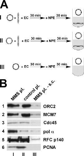 Figure 4. Damaged plasmid blocks sperm chromatin replication by preventing loading of the pol clamp protein PCNA onto the assembling replication complex. (A) Experimental strategy. Either damaged (I), or undamaged (II), plasmid was mixed together with sperm chromatin in EC and incubated for 30 min. NPE was added and, after an additional 30-min incubation, the reactions were centrifuged through a sucrose cushion to isolate the sperm chromatin. A third reaction (III), which contained damaged plasmid alone, was also included. Plasmids were included at a concentration of 3 ng/μl. (B) The pellet fractions from the sucrose density centrifugations depicted in A were probed, by immunoblotting, for the presence of the ORC2 subunit of ORC (row 1); the MCM7 subunit of the MCM complex (row 2); Cdc45 (row 3); the large, catalytic subunit of pol α (row 4); the large subunit of RFC (row 5); or PCNA (row 6). The lanes are demarcated I, II, and III, and refer to the reactions labeled I, II, and III, respectively, in A. |