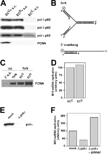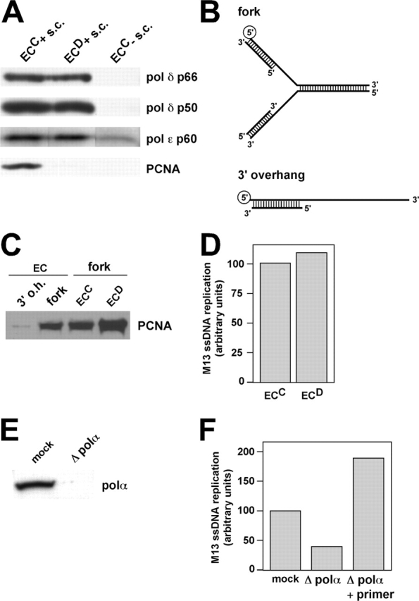 Figure 5. Pol α and PCNA are not directly down-regulated by the replication arrest pathway. (A) ECC and ECD were prepared as in Fig. 3. 2,000/μl sperm chromatin was added (to ECC in ECC + s.c. lane, and to ECD in ECD + s.c. lane) and the reactions were incubated for 30 min. NPE was added and incubation was continued for 30 min. The chromatin was isolated and probed for the presence of pol δ (50- and 66-kD subunit), pol ε (60-kD subunit), and PCNA. To control for the specificity of the chromatin isolation procedure, a sample containing ECC but lacking sperm chromatin was also processed and analyzed (ECC − s.c. lane). (B) Schematic renditions of the DNA structures used to assess PCNA DNA-binding activity. The circled “5′” refers to the position of the biotin group on the 5′ end of the top strand in each structure. See text and methods for details on construction of these structures. (C) The indicated DNA structure was incubated in the indicated extract for 30 min (EC, ECC, and ECD refer to the extracts described in Fig. 3). The structures were recovered on a magnetic stand, the beads were washed, and bound proteins were eluted with SDS-PAGE sample buffer. The eluted proteins were probed for PCNA by immunoblotting. (D) M13 ssDNA was added, along with radio-labeled dATP and the indicated supplements, to either ECC or ECD. After a 30-min incubation, replication of the M13 ssDNA was assessed by agarose gel electrophoresis as described for sperm chromatin in Fig. 3 B. (E) ECD extract was treated with immobilized antibodies against pol α (Δ pol α) or with immobilized nonspecific antibodies (mock), and the depleted extracts were probed by immunoblotting for pol α (p60 subunit). (F) M13 ssDNA replication was measured in the extracts described in E. The sample labeled “Δ pol α + primer” received M13 ssDNA to which the M13 universal primer had been preannealed. |