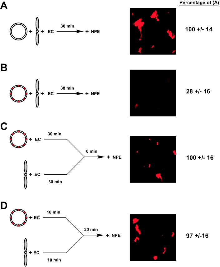 Figure 2. The block to replication of sperm chromatin is dependent on when the sperm chromatin is exposed to the damaged plasmid. (A) Undamaged plasmid DNA or (B–D) MMS-treated plasmid DNA was mixed with egg cytosol (EC) at 3 ng/μl. In A and B, the plasmids were incubated together with the sperm chromatin (2,000/μl in all cases) for the entire 30-min incubation in EC. In C, the plasmid and sperm chromatin were incubated separately in EC and combined just before addition of NPE. In D, the plasmid and sperm chromatin samples were incubated separately in EC for 10 min, and combined for 20 min before addition of NPE. After a 30-min incubation in NPE, replication of sperm chromatin was assessed as in Fig. 1. The micrographs show representative results from each experiment, and the numbers (±1 SD) refer to quantification of the fluorescence intensity data (see Fig. 1 D, for a description of the quantification). The average fluorescent signal intensity value for A was arbitrarily set to 100, and the other values adjusted accordingly. |