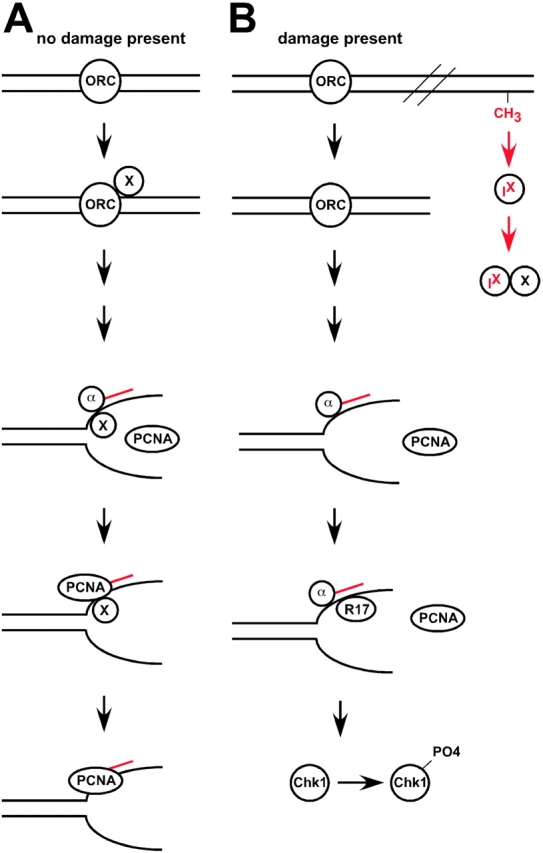 Figure 8. A model for the replication arrest pathway, and how it is coupled to S-phase checkpoint activation. Pol α is designated by “α”, and Rad17 is designated by “R17”. See Results for details. |