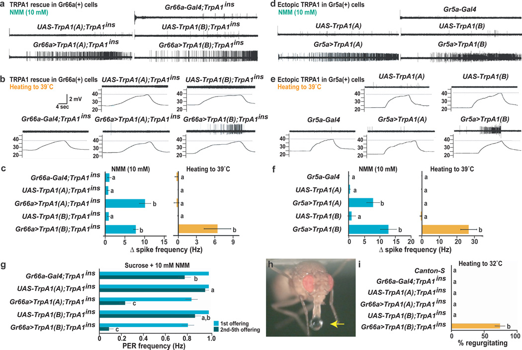 TrpA1 mutant, berberine-sensitive i-type bristles expressing different TRPA1 isoforms. Responses to NMM (a) and warming (b). c, Quantitation. d–f, L-type bristles expressing TRPA1 isoforms. Responses to NMM (d) and warming (e). f, Quantitation. g, Rescue of TrpA1 mutant behavioral response to NMM-containing food. PER, proboscis extension response. h, Warmth-induced regurgitation in TrpA1 mutant rescued with TRPA1(B). i, Regurgitation upon warming from room temperature to 32°C. In c, f, g and i, statistically distinct groups marked by different letters (Tukey HSD, α = 0.01). Data are mean ± s.e.m.