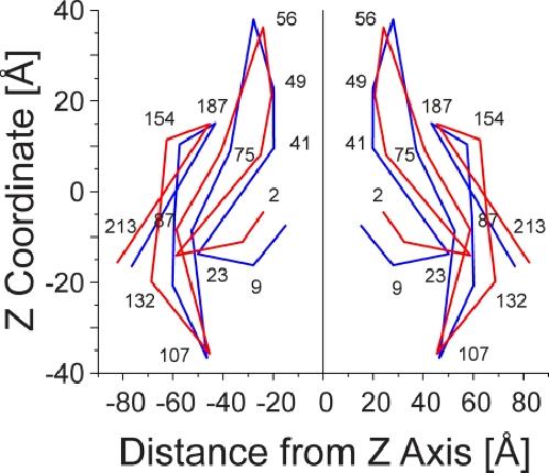 Figure 2. Skeleton drawings of selected portions of the crystal and average of all equilibrated structures to show gross changes resulting from structural equilibration by MD simulations. Superimposition of the skeleton of the crystal structure (blue) and the average of all equilibrated structures (red).