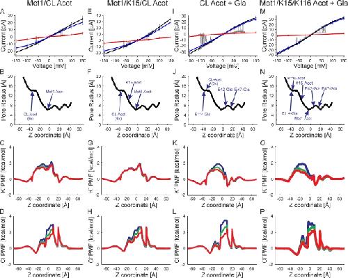 Figure 6. Superimposition of experimental I-V relations (gray traces) and those computed by GCMC/BD simulations with the charge effects of the indicated protein modifications. (A) The correspondence between slight outward rectification (Fig. 3 E) and simulated channel with neutralization of Met1 and six internal lysine residues in TM2/CL. The charge neutralizations mimic acetylation. The black line is the total current, the blue line is the K+ current, the red line is the Cl− current, and the gray line is the single-channel current trace. (B) The pore radius of the simulated channel structure plotted against the z coordinate. The positions of the modified atoms are shown. The six acetylated lysine residues at the tip of TM2/CL are grouped into one position and labeled “CL-Acet 6x.” (C) The PMF of K+ at three voltages, 150 mV (blue), 0 mV (green), and −150 mV (red), plotted against the z coordinate. (D) The PMF of Cl− determined at the same three voltages. (E–H) Outwardly rectifying experimental I-V relation corresponds to simulated I-V relations in which Met1, K15, and six lysine residues in TM2/CL are neutral-mimicking acetylation. (I–L) Inward sigmoidal experimental I-V relation corresponds to simulated I-V relations in which the six lysine residues in TM2/CL are neutralized (acetylated) and the three glutamate residues are modified by γ-carboxyglutamation (Gla). (M–P) Slightly inward rectifying experimental I-V relations correspond to simulated I-V relations in which Met1, K15, and K116 are neutralized (acetylated) and the three glutamate residues are modified by γ-carboxyglutamation (Gla).
