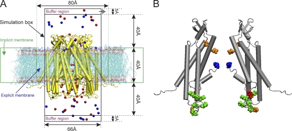 Figure 4. (A) Schematic representation of the GCMC/BD system for Cx26 hemichannels. A Cx26 hemichannel (yellow) inserted into the explicit POPC membrane system was integrated into the implicit membrane system of the GCMC/BD program to ensure a tight seal between the irregular conical surface of the Cx26 channel and the implicit membrane. The boundaries of the implicit and explicit membranes are indicated by the dotted green lines. The simulation box (66 × 66 × 120 Å) was separated by the channel/membrane into two compartments, each containing 100 mM KCl. The buffer region maintains the chemical potential in the two compartments by creating and destroying ions with a GCMC algorithm. The upper compartment (extracellular part of the channel) was defined as the ground in voltage applications. 20 replicate 450-ns simulations were performed at each of seven voltages, ±150, ±100, ±50, and 0 mV, to plot the I-V relations. Blue circles, K+; red circles, Cl−. (B) Positions of modified residues identified by Locke et al. (2009) that would alter the distribution of charge in the Cx26 channel pore, shown in a side view of two opposite subunits of the completed crystal structure. The positions of acetylated residues are colored as follows: blue, Met1; red, K15; green, K102, K103, K105, K108, K112, and K116 in CL/TM2; orange, γ-carboxyglutamated residues E42, E47, and E114.