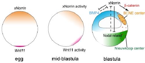 Figure 8. A model of dorsal specification in Xenopus.During oogenesis, maternal xNorrin and Wnt11 are localized to the animal and vegetal poles, respectively. After fertilization, both mRNAs are enriched at the dorsal side, leading to two localized activity domains: BCNE center and Nieuwkoop center. xNorrin in the dorsal animal cells helps to specify neuroectoderm fate by activating a Wnt/β-catenin signaling domain, the BCNE center, and also participates in antagonizing the Nodal-related signal from the vegetal half and the BMP signal from the ventral side. Wnt11 in the dorsal vegetal domain is required for β-catenin activation in all dorsal regions, including in the BCNE center. Yellow: xNorrin and BCNE center. Purple: Wnt11. Red dots indicate stabilized β-catenin. Green: Nieuwkoop center. |