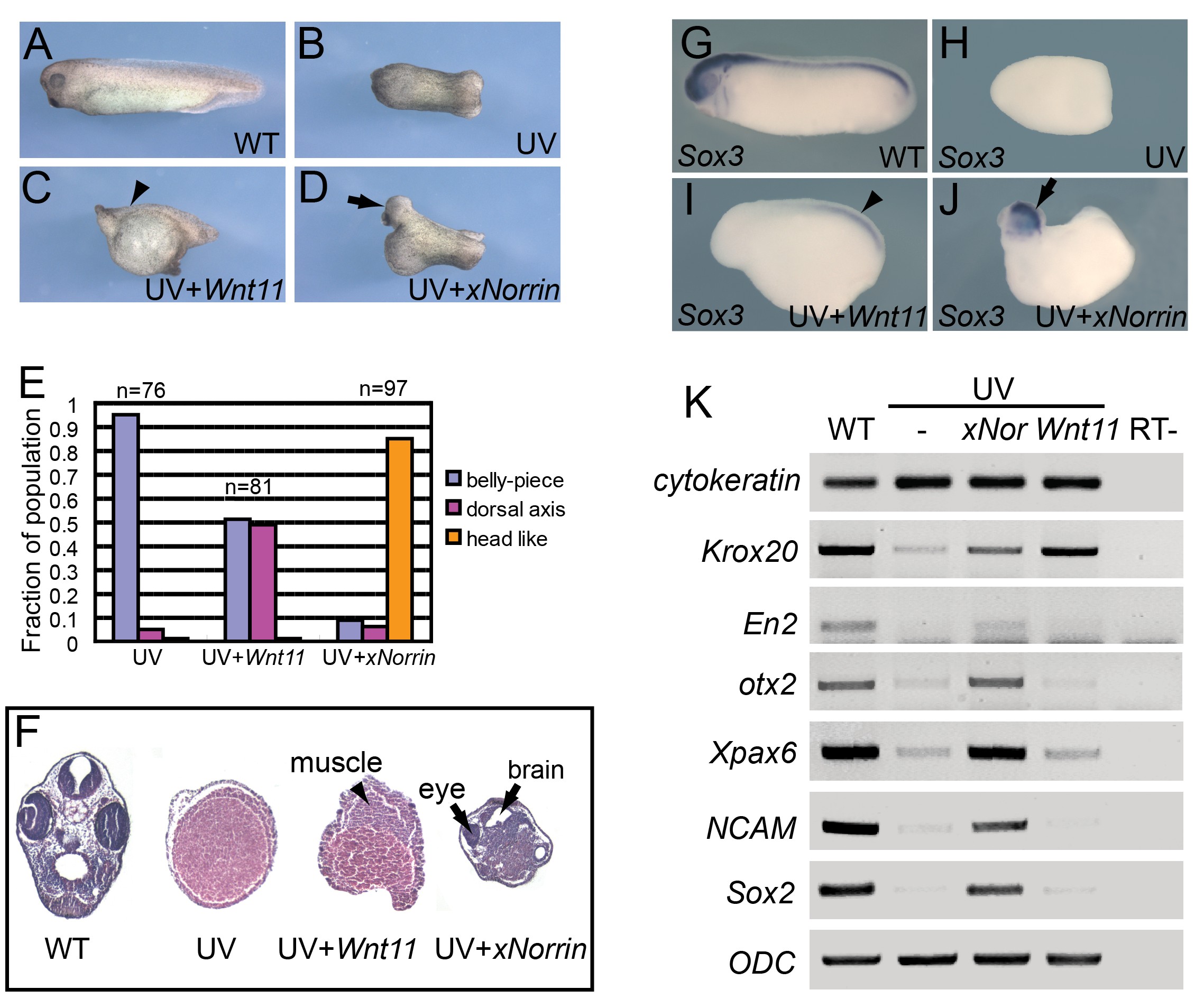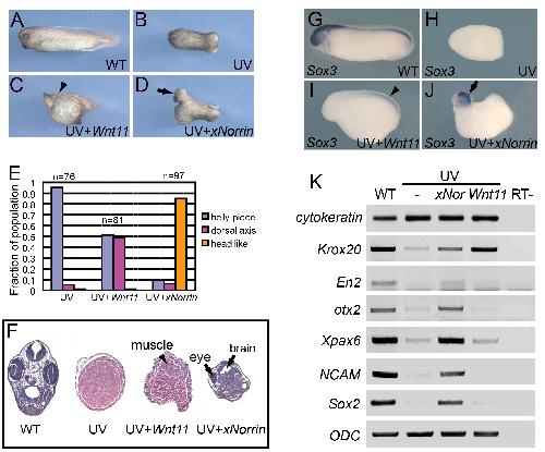 Figure 1. xNorrin induces anterior CNS formation in ventralized embryos. (A-D) xNorrin mRNA induces anterior neural tissues, while Wnt11 mRNA restores only a partial dorsal axis (without anterior structures) in UV-irradiated embryos. (A) A wild-type embryo (stage 33); (B) an embryo UV-irradiated (50 uJ) at the vegetal pole; (C) a UV-irradiated embryo injected with Wnt11 mRNA (500 pg) into one cell at the four-cell stage (arrowhead: partial dorsal axis); (D) a UV-irradiated embryo injected with xNorrin mRNA (500 pg) as in (C) (arrow: head). (E) Summary of (A�D). Fraction of the population within each group is indicated. (F) Histological analysis of stage 40 embryos. Arrowhead: muscle; arrows: brain and eye. (G�J) Whole-mount in situ hybridizations to Sox3. (G) A wild-type (WT) embryo (100%, n = 65); (H) a UV-treated embryo (4% Sox3 positive, n = 70); (I) a UV+Wnt11 (500 pg) rescued embryo (45% Sox3 positive, n = 77); (J) a UV+xNorrin (500 pg) rescued embryo (83% Sox3 positive, n = 69). All embryos are shown with the anterior pole to the left. Arrowhead: posterior neural structure; arrow: anterior neural structure. (K) Neural marker expression detected by RT-PCR. xNorrin induced expression of anterior neural and pan-neural markers (En2, otx2, Xpax6, NCAM, and Sox2) in UV-irradiated embryos. Wnt11 induced only the hindbrain marker Krox20 in UV-irradiated embryos. |