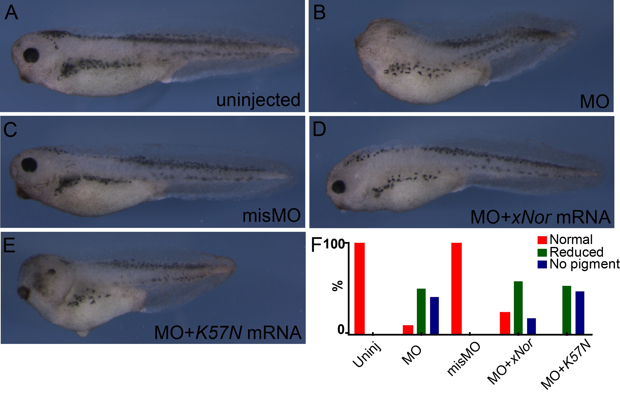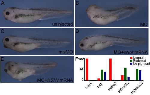 Figure S7. The xNorrin K57N mutant failed to efficiently rescue anterior defects in xNorrin morphants. (A-E) An uninjected embryo (A). A xNor-MO (20 ng)-injected embryo (B). Note the lack of eye pigment. A xNor-misMO (20 ng)-injected embryo (C). A xNor-MO and wild-type Norrin RNA (50 pg) co-injected embryo (D). A xNor-MO and xNorrin K57N RNA (50 pg) co-injected embryo (E). (F) Summary of anterior defect frequency in (A-E). Uninjected: n = 40; MO: n = 24; xNor rescue: n = 20; K57N rescue: n = 19; misMO: n = 15. RNAs and MO were injected into the dorsal animal region at the four-cell stage. All embryos shown are around stage 36. |