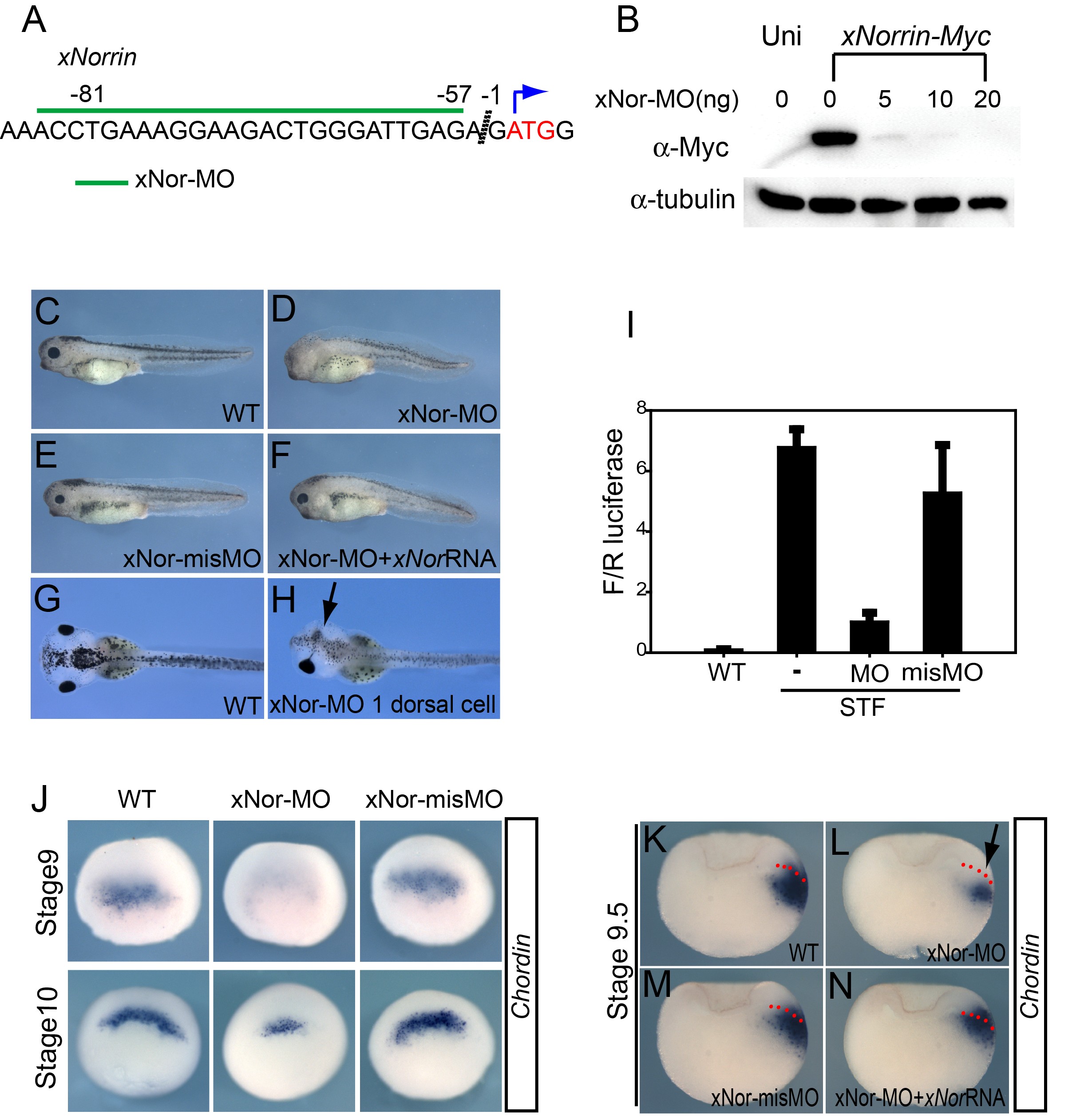 Figure 3. Maternal xNorrin is required for dorsal ectoderm specification. (A) The xNor-MO target sequence (green line) in xNorrin mRNA. (B) xNor-MO dose-dependently suppresses xNorrin-Myc (1.5 ng) mRNA translation in Xenopus embryos. xNorrin-Myc was detected using an anti-c-Myc monoclonal antibody. Uni, no xNorrin-Myc injected. (C-F) xNorrin is required for head formation. (C) A wild-type (WT) stage 35 tadpole. (D) xNor-MO (20 ng) caused anterior truncation (61%, n = 64) when injected into the animal regions of two dorsal cells in four- to eight-cell-stage embryos. (E) xNor-misMO-injected embryos are generally normal (88%, n = 66). (F) The anterior defects caused by NorMO were rescued by xNorrin (25 pg) mRNA (77%, n = 81). (G) Dorsal view of a wild-type tadpole at stage 45. (H) Anterior defects on only one side (arrow) were generated by injecting xNor-MO (10 ng) into one dorsal cell at the four- to eight-cell stage (63% of injected embryos showed defects in the injected side, n = 30). The other side shows normal morphology. The anterior end is to the left. (I) xNor-MO inhibits Wnt signaling in dorsal animal cells. xNor-MO and SuperTopFlash (STF) reporter plasmids were co-injected into the dorsal animal cells of eight-cell embryos. F/R luciferase: ratio of firefly luciferase reading to renilla luciferase reading. (J) Whole-mount in situ hybridization shows that Chordin expression is reduced at stage 9 (53% of injected embryos, n = 80) and stage 10 (61% of injected embryos, n = 79) in xNor-MO-injected embryos, compared to xNor-misMO-injected embryos or uninjected embryos. (K-N) Whole-mount in situ hybridization for Chordin in bisected xNor-MO-injected embryos (stage 9.5) showing that xNor-MO inhibits Chordin expression in neuroectoderm precursors (arrow) (reduction in 66% of injected embryos, n = 104) (L) compared to wild-type embryos (K) and embryos with xNor-misMO injected into dorsal animal cells at the eight- to 16-cell stage (reduction in 13% of injected embryos, n = 78) (M). Note that xNorrin mRNA (100 pg) rescues Chordin expression in the dorsal ectoderm (80% of co-injected embryos showed expression comparable to wild-type embryos, n = 50) (N). Embryos are oriented such that their dorsal side is on the right. Dotted lines indicate the boundaries between the deep mesoderm and the superficial ectoderm. |