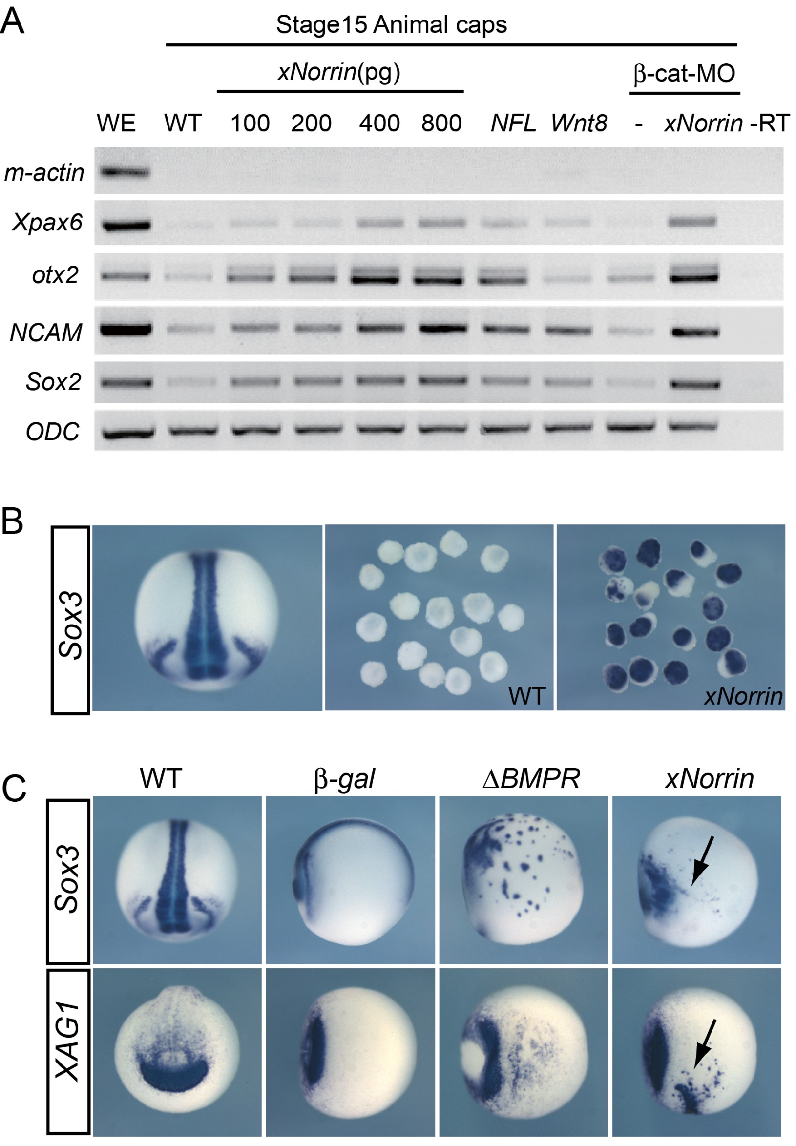 Dorsal-ventral specification in the amphibian embryo is controlled by β-catenin, whose activation in all dorsal cells is dependent on maternal Wnt11. However, it remains unknown whether other maternally secreted factors contribute to β-catenin activation in the dorsal ectoderm. Here, we show that maternal Xenopus Norrin (xNorrin) promotes anterior neural tissue formation in ventralized embryos. Conversely, when xNorrin function is inhibited, early canonical Wnt signaling in the dorsal ectoderm and the early expression of the zygotic neural inducers Chordin, Noggin, and Xnr3 are severely suppressed, causing the loss of anterior structures. In addition, xNorrin potently inhibits BMP- and Nodal/Activin-related functions through direct binding to the ligands. Moreover, a subset of Norrin mutants identified in humans with Norrie disease retain Wnt activation but show defective inhibition of Nodal/Activin-related signaling in mesoderm induction, suggesting that this disinhibition causes Norrie disease. Thus, xNorrin is an unusual molecule that acts on two major signaling pathways, Wnt and TGF-β, in opposite ways and is essential for early neuroectoderm specification.