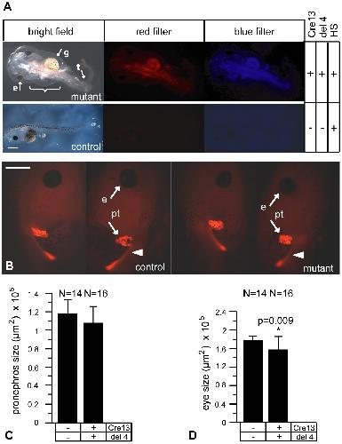 Effects of tailbud-stage overexpression of P328L329del HNF1β mutation on larval development. Representative larvae of crossings between heterozygous HSPCre13 males and heterozygous 328del4 females. The F1 offspring were heat-shocked for two hours at 34 at tailbud stage (st. 25). A: Comparison of a larva with overexpressing the P328L329del HNF1β mutation with a non-transgenic control. Red fluorescence: HSPCre13 transgene. Blue fluorescence: 328del4 transgene. C and D: Quantitation of the average pronephric kidney (C) and eye sizes (D) in mutant and control animals. * = p<0.01 (Student's t-test). N refers to the number of single pronephri or eyes that were measured. Scale bar = 1 mm.