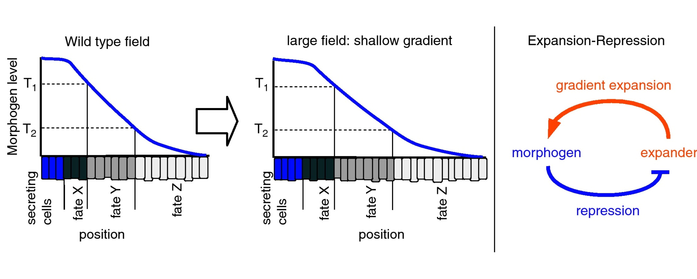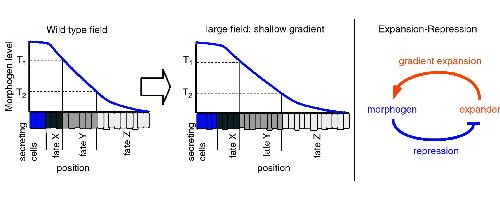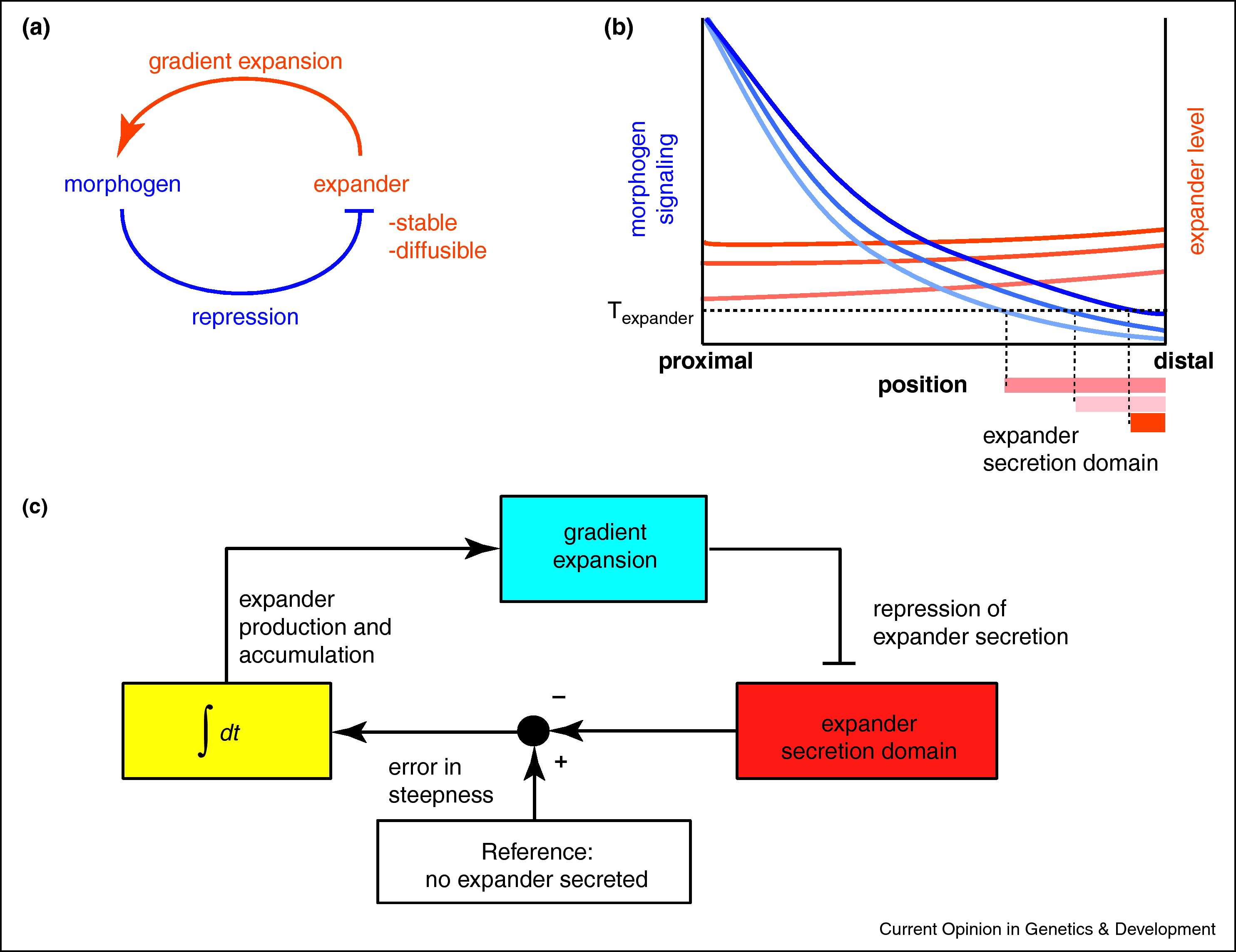 Figure 3. The Expansion–Repression mechanism. (a) The Expansion–Repression feedback topology. The morphogen (blue) represses the secretion of an expander (orange). The expander, which is diffusible and stable, expands the morphogen gradient. (b) Expansion of the morphogen gradient (pale to bright blue) leads to the gradual restriction of the expander secretion domain towards the distal region of the morphogenic field (pale to bright orange bars). Texpander is the threshold for expander secretion repression. The gradient continues to expand until the expander is repressed in almost the entire field. The expander accumulates during the expansion of the gradient (pale to bright orange), such that larger fields will require higher levels of the expander. (c) An integral feedback lies at the heart of the Expansion–Repression mechanism. Expander secretion (red) is compared to the reference, no secretion of the expander (white). The error, which is the expander-secretion domain, translates into expander secretion and accumulation over time (yellow). Increase in expander levels leads to gradient expansion (blue), which results in restriction of the expander-secretion domain. The control circuit stabilizes when the error is zero, that is, when the expander is not secreted.