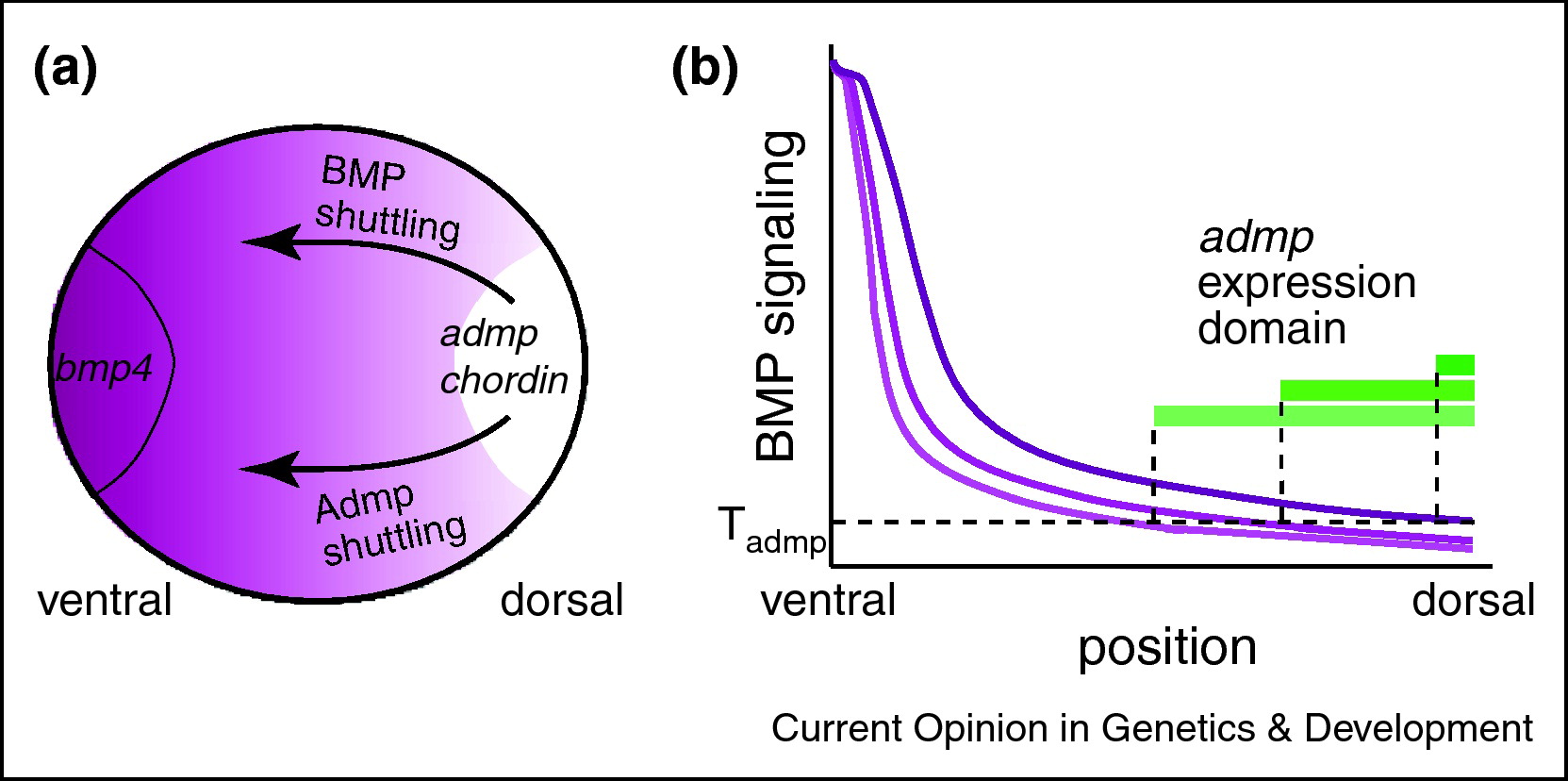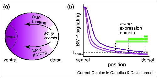 Figure 2. Scaling of the BMP gradient in Xenopus laevis embryos. (a) Schematic representation of the BMP gradient (magenta) along the dorso-ventral axis of Xenopus laevis embryos. admp, a BMP ligand, is repressed by BMP signaling and therefore its expression is confined to the dorsal most region of the embryo, the Spemann organizer (white) where it is co-expressed with BMP inhibitors such as Chordin. bmp4, another BMP ligand is expressed at the ventral pole, where BMP signaling is highest. Admp, as well as the other BMP ligands are shuttled ventrally by their inhibitor Chordin. (b) Shuttling of Admp and its accumulation along the DV axis leads to the expansion of the BMP gradient (magenta) and the repression of admp expression (green bars) in virtually the entire field. Light shades of magenta denote earlier stages of the dynamics, dark shades denote later stages. Close to steady state, admp repression fixes signaling at the dorsal region of the field to Tadmp, the admp repression threshold.