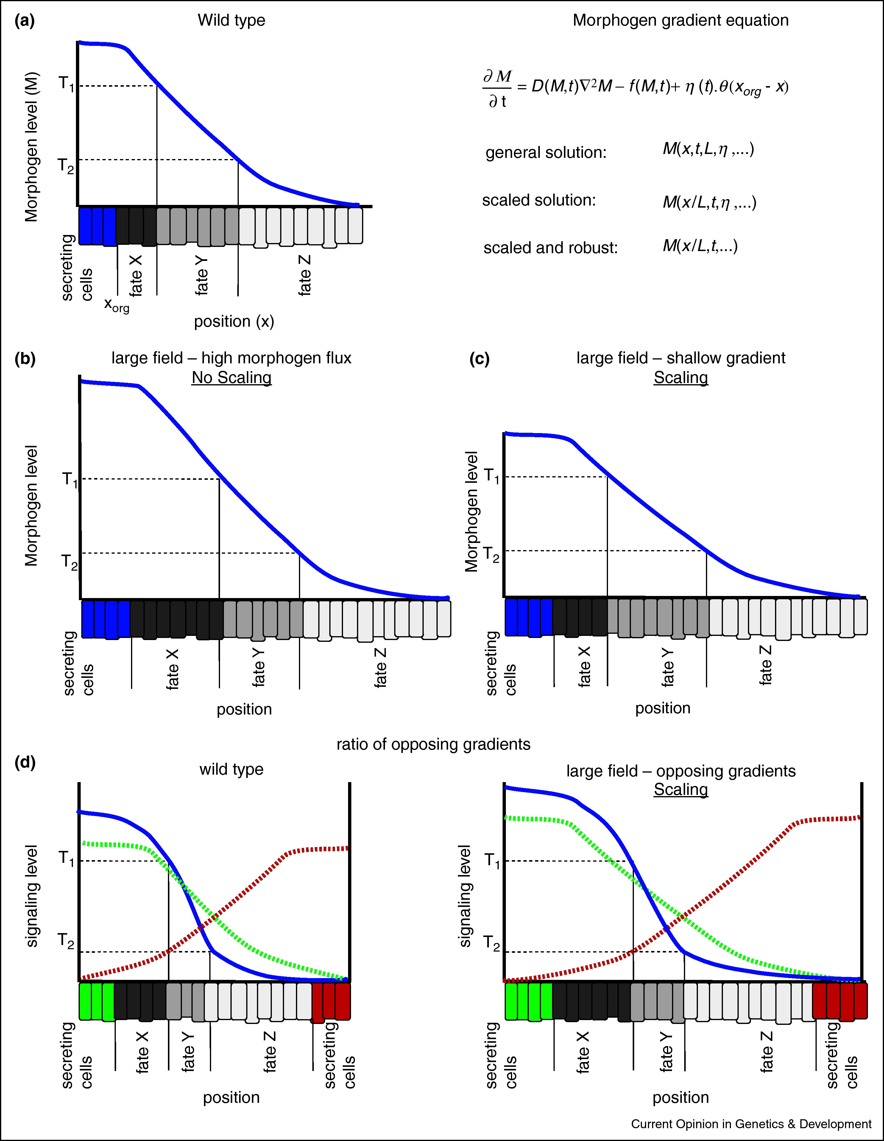 Figure 1. Scaling of morphogen gradients. (a) Left panel: the morphogen gradient paradigm: the morphogen is secreted from a small number of cells (secreting cells, blue) and creates a gradient along a field. Cells close to the morphogen source sense high levels of the morphogen, above threshold T1, and differentiate into fate X (dark gray). Cells that sense intermediate levels, between thresholds T1 and T2 adpot fate Y (medium gray). Cells far from the source sense low levels, below threshold T2 and differentiate into fate Z (light gray). Right panel: general equation describing a morphogen gradient. M is the morphogen concentration, D(M,t) and f(M,t) its diffusion and degradation terms, which may depend on the morphogen concentration through feedbacks and on time. η(t) is the morphogen production term, typically restricted to a small group of cells at the edge of the field {x|0 < x < xorg}. The solution for this equation, M(x,t,L,D,f,η), will scale with size if it is a function of x/L, the relative position rather than of x, with L the size of the field. Robustness to the morphogen production terms implies that the solution is independent of the value of η. (b) Modulation of morphogen flux does not account for scaling. Increasing morphogen flux in larger fields changes the proportions between different cell fates in the field relative to the wild type size. (c) Scaling of morphogen gradients requires modulation of the sharpness of the gradient to maintain the same proportions of cell fates. (d) The ratio (blue) between two gradients emanating from opposing edges of the field (green and red) can provide scaling of a signaling gradient. Left panel: wild type field; right panel: larger field.