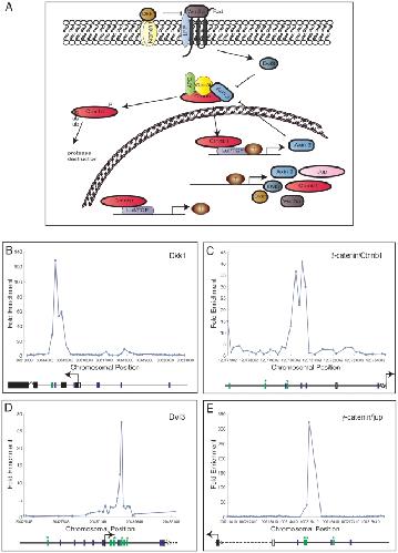 Figure 3. Components of the Wnt pathway as Brachyury targets.(A) The Wnt signalling pathway. Arrows indicate positive interactions and bars represent negative interactions. Targets identified in this study are outlined in bold. (BâE) Brachyury binding in genomic regions around Dkk1 (B); Ctnnb1/β-catenin (C); Dvl3 (D); and γ-Catenin/jup/plakoglobin (E). Each target shows fold enrichment against chromosomal position. Blue bars represent the T box-like site TSACANNT (Nâ=âany base, Sâ=âG/C) and green bars represent (AC)n. Stars above bars represent sequence on the reverse strand. Plots are average of triplicate chip results, aligned to the mm8 Feb. 2006 assembly. |