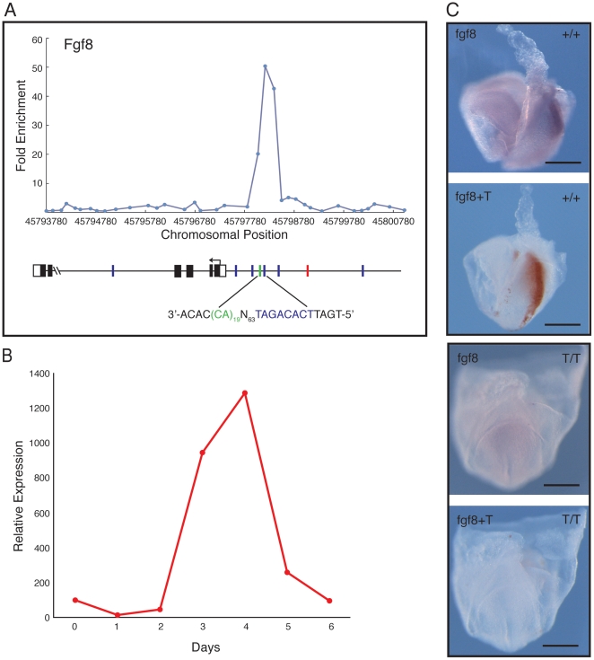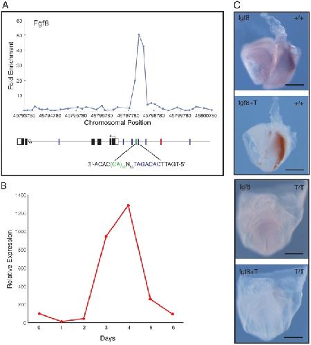 Figure 6. Fgf8 as a target of Brachyury.(A) Location analysis of Fgf8. For details of methods see legend to Fig. 4. (B) Quantitative RT-PCR expression profile for Fgf8 during ES cell differentiation, expressed relative to beta actin. (C) Expression of Fgf8 studied by in situ hybridisation. The images show a phenotypically wild type (+/+ or +/T) embryo (top pair) and a mutant T/T (bottom pair) embryo derived from crosses of Brachyury heterozygous mutant mice. The wild type embryo is orientated with anterior to the left and posterior to the right; the mutant is viewed from the posterior. Fgf8 expression is detected with NBT/BCIP (purple) and Brachyury with INT/BCIP (orange brown). In the wild type embryo Fgf8 is expressed in the primitive streak and paraxial mesoderm; such expression is absent or greatly reduced in the mutant. Scale bars indicate 200 µm. |