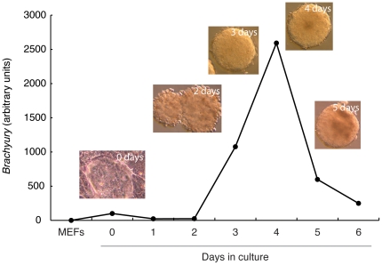 Figure 1. Temporal expression pattern of Brachyury during early ES cell differentiation.The graph shows a quantitative RT-PCR profile from an embryoid body spinner culture. Brachyury expression is calculated relative to beta actin. Images show undifferentiated R1 cells on mouse embryo fibroblast feeders at day 0, early blast colonies at day 2, and embryoid bodies at days 3, 4 (when they are cross-linked) and 5. |