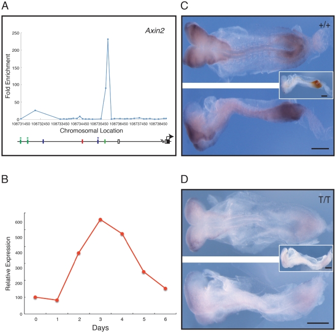 Figure 5. Analysis of Axin2, a negative regulator of the Wnt pathway.(A) Location analysis of Axin2. For details see legend to Fig. 4. (B) Quantitative RT-PCR expression profile for Axin2 during ES cell differentiation, expressed relative to beta actin. (C, D) Expression of Axin2 studied by in situ hybridisation; in each, the top image shows a dorsal view, and the bottom image a lateral view. (C) Phenotypically wild type (+/+ or +/T) embryo at E8.5â8.75 and (D) a mutant (T/T) embryo, both derived from crosses of Brachyury heterozygous mutant mice. Axin2 expression is detected with NBT/BCIP (purple) and the insets show a lateral view after double staining for Brachyury detected with INT/BCIP (orange brown). Note that in the wild type embryo Axin2 is expressed in tailbud, paraxial mesoderm and lateral margin of the neural folds. In the mutant embryo expression of Axin2 is greatly reduced (nâ=â9). Scale bars are 250 µm. |