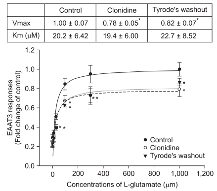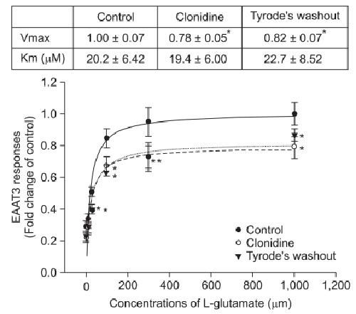 Fig. 2. Effects of clonidine on EAAT3 activity. The EAAT3 responses to various L-glutamate concentrations were measured before (control group) and immediately after clonidine treatment (clonidine group) and after a 4-min Tyrode's perfusion (Tyrode's washout). The Vmax and Km values of EAAT3 response to L-glutamate are listed in the table above the figure. Data show the means ± SEM (n = 9-17 in each data point). *P < 0.05 compared to the corresponding values in the control group.