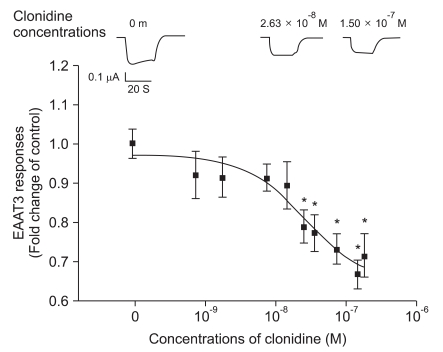 Fig. 1. Dose-response of clonidine inhibition of EAAT3 responses to 30 µM L-glutamate. The IC50 value for this inhibition was 2.72 × 10-8 M. The upper graphs show typical current traces induced by the application of 30 µM L-glutamate. Data show the means ± SEM (n = 25-50 in each data point). *P < 0.05 compared to control.