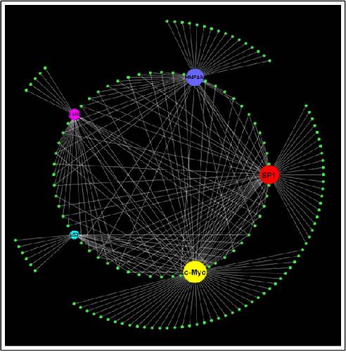 Figure 4. SP1 Network. The network shows SP1 (enclosed by a black circle) with its 56 targets from the bait list.
