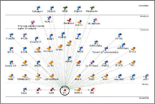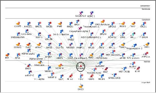 Figure 3. c-Myc Network. The network shows c-Myc (enclosed by a black circle) with its 71 targets from the bait list. The horizontal lines separate the proteins in the network into the following categories: extracellular, membrane, cytoplasm, nucleus, and unspecified. The various symbols used in the network have been described in detail in the supplementary information [Additional file 7].