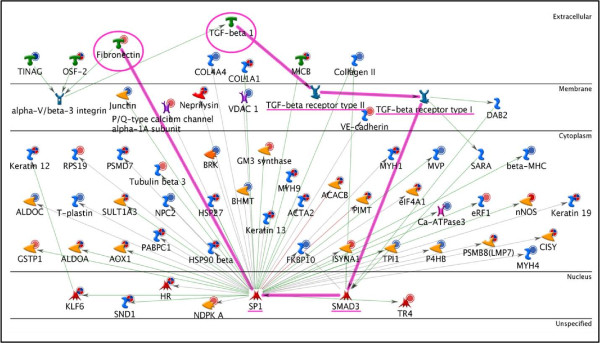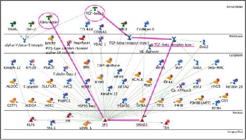 Figure 5. TGF-β1, SP1, FN network. The path from TGF-β1 to SP1 that ultimately leads to the activation of FN has been highlighted. The start point (TGF-β1) and end -point (FN) are highlighted with a circle and the connecting proteins are underlined.