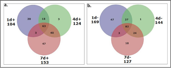 Figure 1. Venn diagram for a) upregulated and b) downregulated groups. The diagram shows the number of up and down regulated proteins in the axolotl proteomics data at 1, 4 and 7 day post amputation. 1d+ refers to the upregulated proteins and 1d- refers to the downregulated proteins at day 1. Other time points can be similarly interpreted. The value under each time point shows the total number of proteins up/down regulated at that time point.