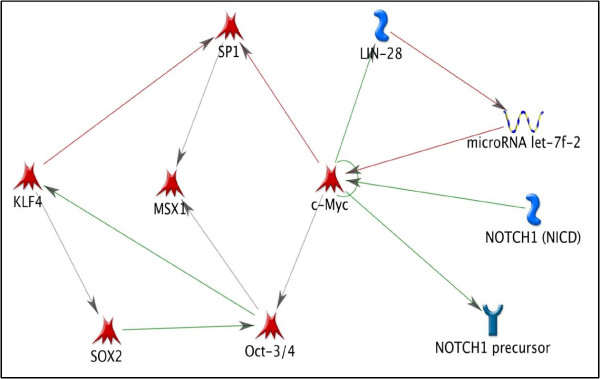 Figure 7. Stemness in limb regeneration. This network highlights the relationship of known stem cell markers (Oct3/4, Sox2, KLF4, Lin28) with TFs identified by this study (c-Myc and SP1) and previously identified TFs in limb regeneration (Msx1 and Notch1).
