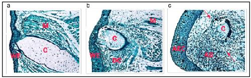 Figure 1. Histology of axolotl hindlimbs. Longitudinal sections of axolotl hindlimbs regenerating from the mid-tibia/fibula, stained with Weigert's iron hematoxylin and light green SF: (a) Sections at 1 day post amputation (dpa). The amputation surface is covered with several layers of wound epidermal (WE) cells, including gland cells. The basal layer of the wound epidermis is in direct contact with underlying tissues. Some cell debris, red blood cells and lymphocytes are present under the wound epithelium. C = cartilage, M = muscle. (b) Sections at 4 dpa. The cartilage (C), muscle (M), and dermal tissue organization is breaking down, releasing cells that dedifferentiate (DC) and migrate toward the wound epithelium (WE). (c) Sections at 7 dpa. Blastema cells have accumulated under a thickened apical epidermal cap (AEC) to form an accumulation blastema (AB). C = cartilage. The arrows indicate the junction between the accumulation blastema and tissues still undergoing dedifferentiation. Magnification = 10 ×. |