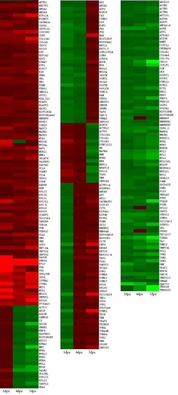 Figure 3. Global Expression intensity map. HeatMap showing upregulation (red) and downregulation (green) of priority 1 and 2 proteins identified as having significant fold changes relative to control. Numbers at bottom of each column indicate days post amputation (dpa). Left column: proteins upregulated on all dpa, or 1 dpa. Middle column: proteins downregulated on 1 and 4 dpa, and upregulated at 7 dpa; proteins upregulated at 1 and 4 dpa and downregulated at 7 dpa; and proteins downregulated at 1 dpa and upregulated at 4 and 7 dpa. Right column: proteins downregulated on all dpa or two of three dpa. Color intensity reflects fold change. |