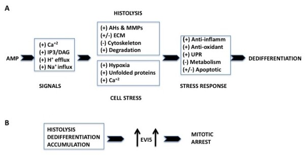 Figure 6. Summary diagram of regeneration processes. (a) Amputation generates signals that result in histolysis and liberation of cells from their tissue matrix. At the same time, these cells are under hypoxic and endoplasmic reticulum (ER) stress, and use a variety of mechanisms to counter this stress and prevent apoptosis, including upregulation of antiapoptotic pathways that protect cell membranes and nuclei. Some proapoptotic pathways are upregulated but are co-opted to remodel or eliminate internal cell structure. Along with changes in transcription factors, chromatin modifying enzymes, microRNAs and polycomb proteins, these mechanisms lead to dedifferentiation. (b) Throughout histolysis, dedifferentiation and accumulation of blastema cells under the wound epidermis, ecotropic viral integrative factor 5 (EVI5) is highly upregulated, preventing blastema cells from undergoing mitosis until after the accumulation blastema has formed. |