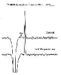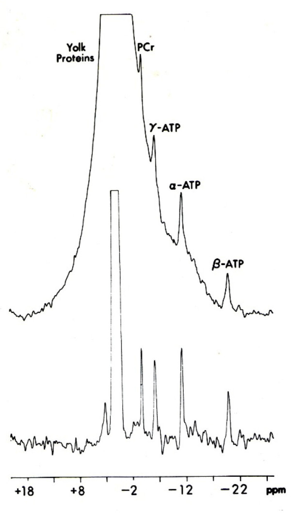 Figure 4. A comparison of the saturation transfer difference spectra of follicles superfused with Ringer's solution (control, upper spectrum) and Ringer's solution containing inducing levels (3.2 UM) of progesterone (lower spectrum) at 20-22°C. The midpoint of the spectral data aquisition corresponded to a 5.5 h exposure to progesterone. A marked decrease in the γP → PCr saturation transfer effect is observed in progesterone-treated oocytes. Again, the large inverted peaks are due to incomplete cancellation of the overwhelming phosvitin signal.