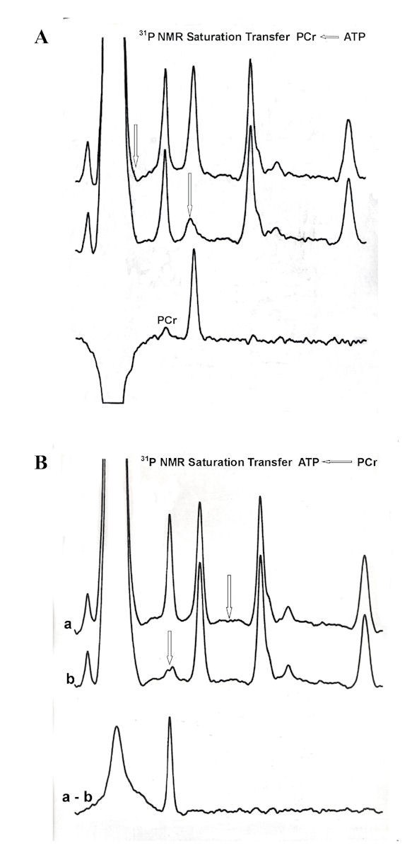 Figure 3. 31P saturation transfer NMR spectra of untreated Rana Pipiens follicles. Arrows indicate where saturation was alternately applied. Upper spectra (A): 31P NMR showing saturation transfer from γP → PCr. The control spectrum with saturating RF placed off-resonance (upper trace), the spectrum with γP resonance saturated (middle trace) and the difference spectrum (lower trace) are compared. Lower spectra (B): 31P NMR saturation transfer results for PCr → γP. The control spectrum (a), the spectrum with PCr saturated (b), and the difference spectrum (a - b). Each spectrum was obtained with a selective low power RF pulse of 5 sec duration placed in the labeled (arrow) position, followed by a 90° nonselective observation pulse and a 0.8 sec acquisition time. A total of 1000 transients were collected at 20°C for each spectrum by alternating the saturating RF between an off resonance and the γP (or PCr) peak positions after each block of 100 transients, as described in the text. A line-broadening of 100 Hz was applied to each spectrum. The large peaks in the difference spectra are due to incomplete cancellation of the overwhelming phosvitin signal.