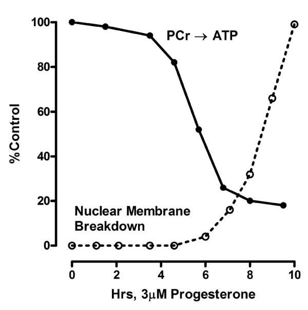 Figure 5. Comparison of changes in the NMR-measured pseudo first order rate constant (kf) for the reaction PCr → ATP and the time course of nuclear membrane breakdown during the first 10 h. Values are expressed as a percent of those for untreated follicles from the same female.