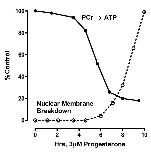 Progesterone triggers resumption of the first meiotic division in the Rana pipiens oocyte by binding to the N-terminal external loop of the catalytic subunit of Na/K-ATPase, releasing a cascade of lipid second messengers. This is followed by internalization of specific membrane proteins, plasma membrane depolarization and nuclear membrane breakdown, culminating in arrest at second metaphase. Progesterone initiates an increase in phosphoryl potential during the first meiotic division, resulting in the accumulation of high energy protein phosphate by second metaphase arrest. 31P-NMR, with saturation transfer, demonstrates that the phosphocreatine level rises ~2 fold and that the "pseudo" first order rate constant for the creatine kinase reaction falls to ~20% of the control by the onset of nuclear membrane breakdown. 32PO4 pulse-labeling reveals a net increase in phosphorylation of yolk protein phosvitin during this period. The increased yolk protein phosphorylation coincides with internalization of membrane Na/K-ATPase and membrane depolarizatio These results indicate that progesterone binding to the catalytic subunit of the Na-pump diverts ATP from cation regulation at the plasma membrane to storage of high energy phosphate in yolk protein. Phosvitin serves as a major energy source during fertilization and early cleavage stages and is also a storage site for cations (e.g. Na+, K+, Ca2+, Fe2+/3+) essential for embryonic development.